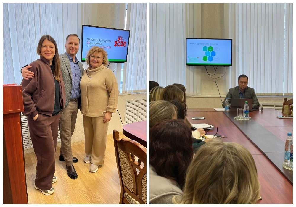 В этот же день налоговые консультанты Татьяна Марзилович, Оксана Грицкова и Артём Валенто провели круглый стол с главными бухгалтерами 22 организаций г. Солигорска на тему «Налоговый дайджест: 26 значимых изменений в Налоговом кодексе 2026».
